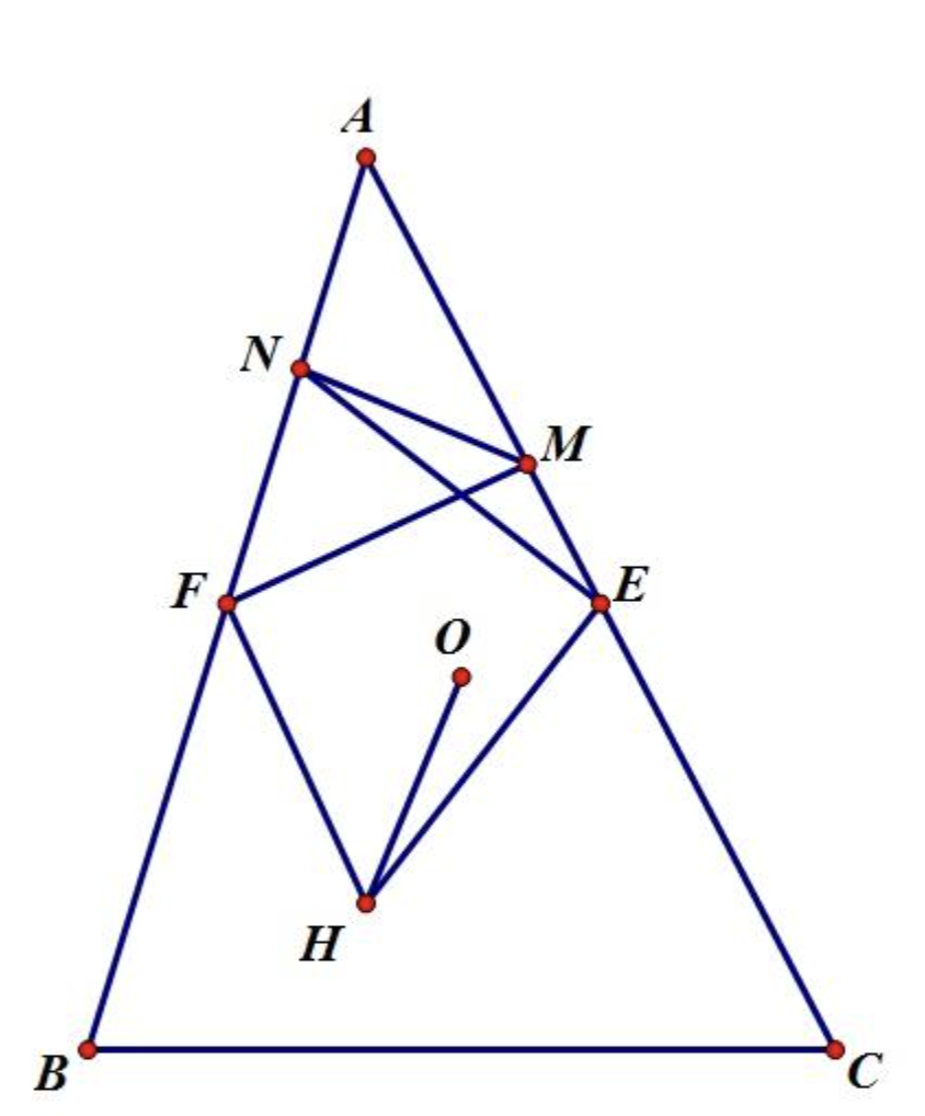 设 $O$,$H$ 分别是 $\triangle ABC$ 的外心和垂心,$E$,$F$ 分别是边 $AC$,$AB$ 的中点,已知 $HF\perp MF$,$HE\perp NE$,$M$ 在 $CA$ 直线上,$N$ 在 $AB$ 直线上. 证明:$HO\perp MN$.